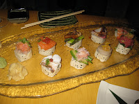 Then we ordered edamame to hold us over until the main event - the roll tasting and a sashimi tasting. The presentation was beautiful and the fish was so fresh. I didn't know what to expect of the roll tasting, but it was one piece of each of the 9 makimono rolls they have on the menu. The base of each roll is the same, just a cucumber roll, and the top is all different. There was a scallop with yuzu and avocado, eel with tobiko, snow crab with avocado, salmon with tempura flakes and other assorted fish with their special sauce on top.